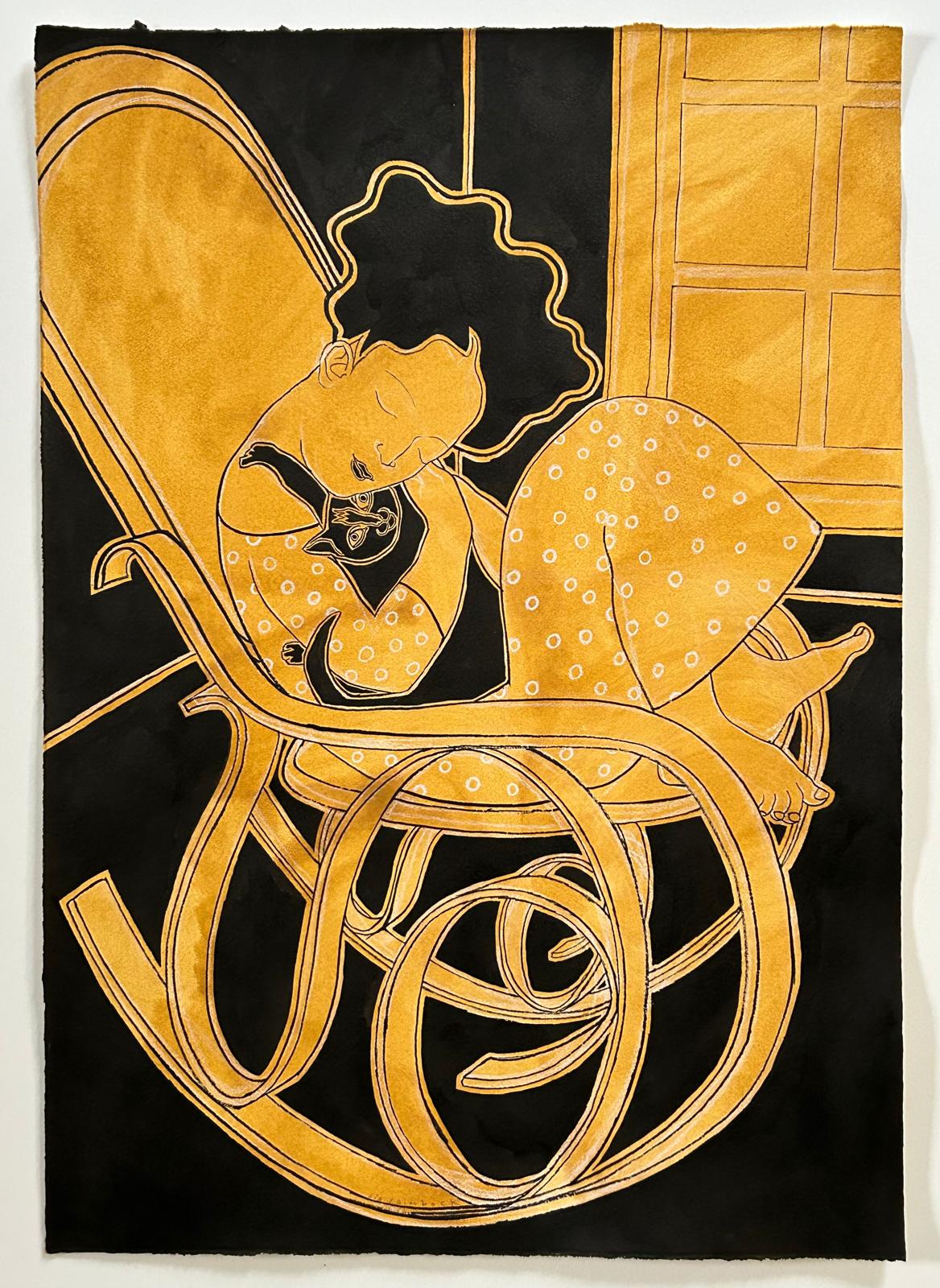 East Indian ink, white pastel pencil and acrylic wash on etching paper.