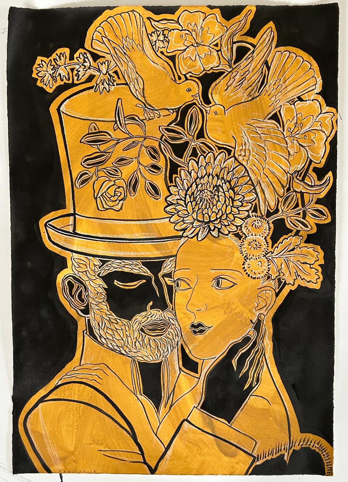 East Indian ink, white pastel pencil and acrylic wash on etching paper.