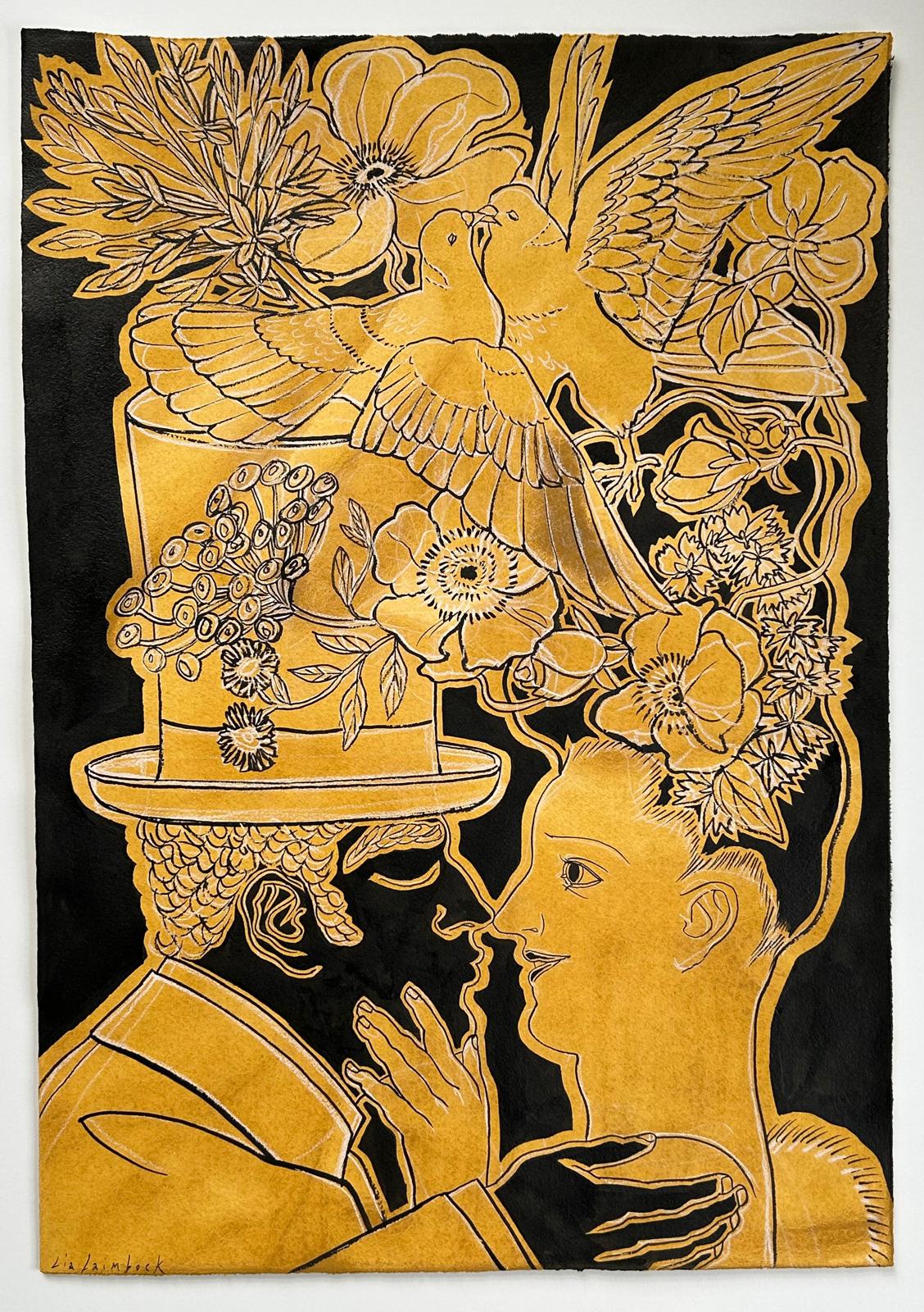 East Indian ink, white pastel pencil and acrylic wash on etching paper.